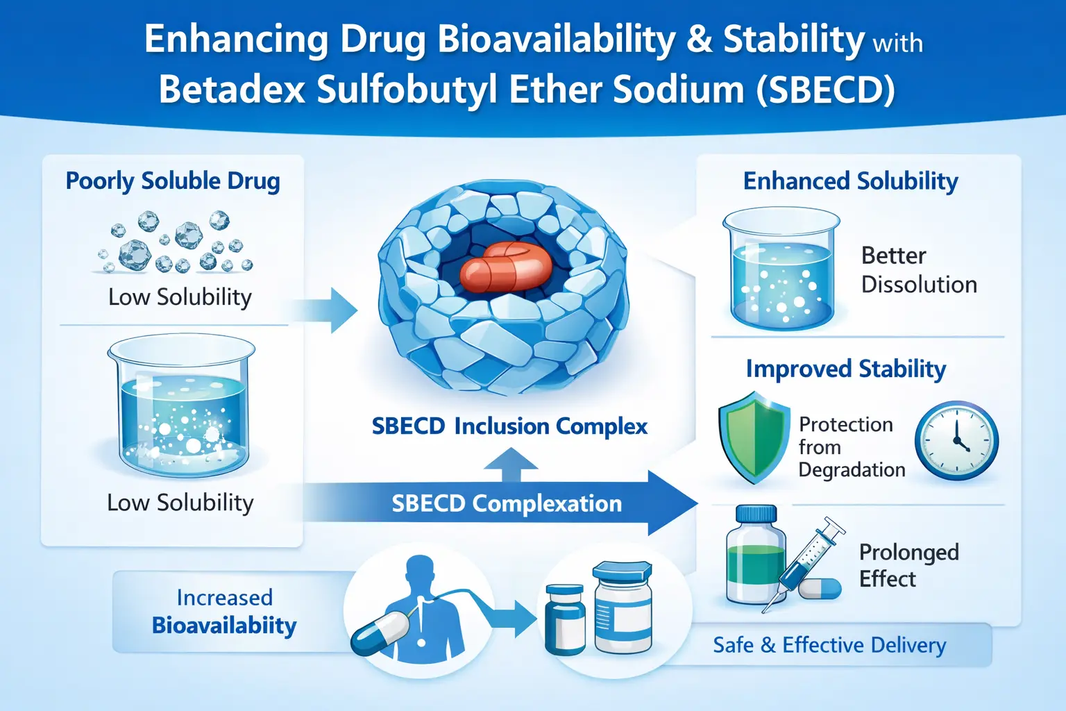 Betadex Sulfobutyl Ether Sodium (SBECD) sendagaiak egiteko modua aldatzen du ondo disolbatzen ez diren sendagaiekin konbinatuz. Ziklodextrina deribatu honek bioerabilgarritasuna hobetzen du molekulak barneratuz, eta horrek produktu kimiko batzuk uretan 1000 aldiz hobeto disolbatzen ditu. Egonkortasunaren igoera SBECD-k sendagaien molekulak apurtzen ez dituelako gertatzen da tratamenduaren eraginkortasuna mantentzen duen bitartean. FDAk onartutako eszipiente gisa, SBECD-k sendagaiak ahoz ematea ahalbidetzen du, lehen ezin zena. Hau bereziki egia da antifungikoen, birusen aurkako eta onkologikoen botiketan.