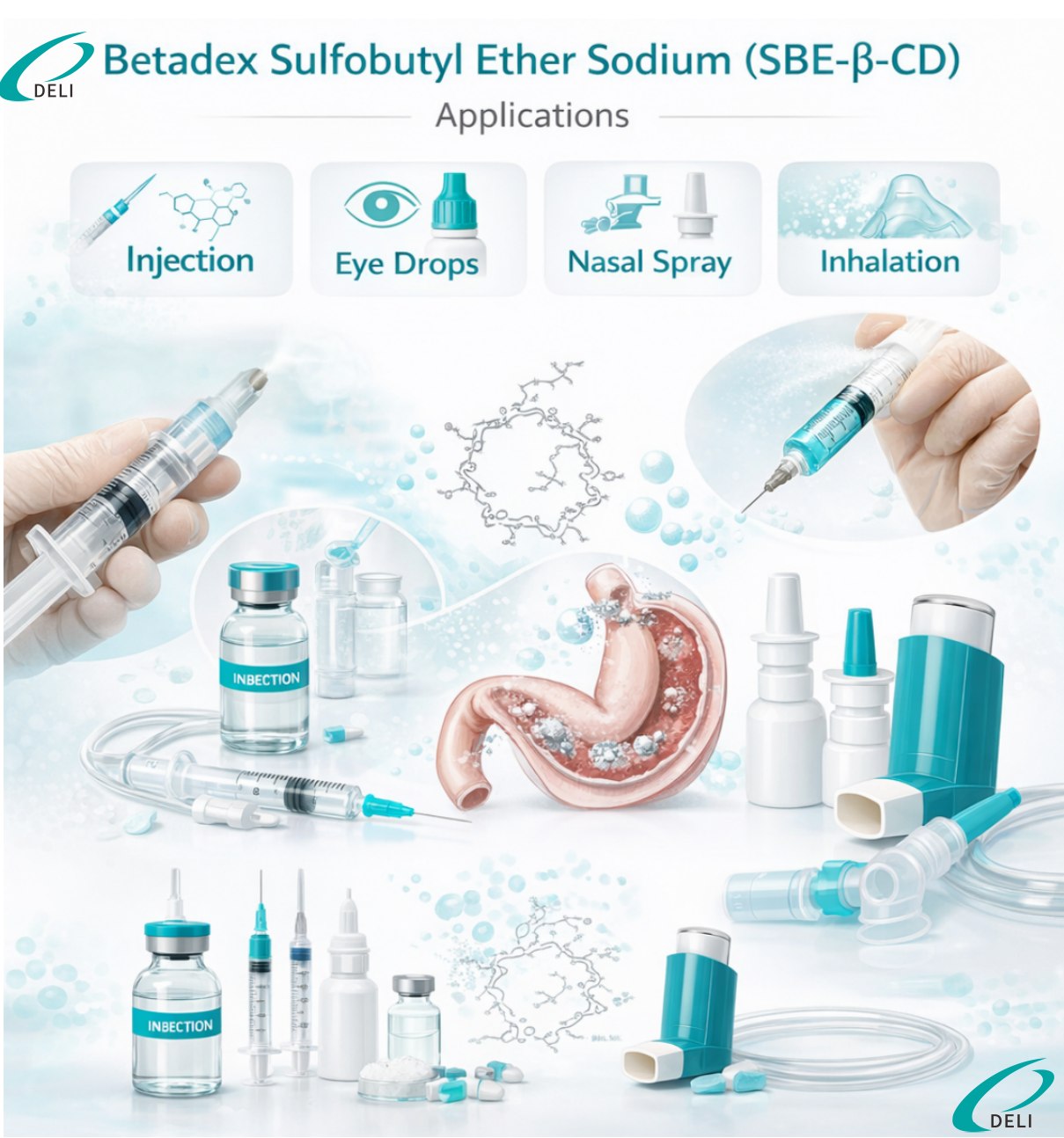 Sulfobutyl Ether Beta Cyclodextrin Sodium Injection Grade batez ere ahoz kanpoko dosi farmazeutikoetan aplikatzen da, formulazioaren ebaluazioaren arabera.