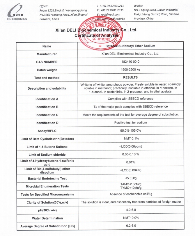 Sulfobutyl Ether Beta Cyclodextrin Sodium injekzio-maila hau kalitatea kudeatzeko sistema integral baten arabera fabrikatzen da. Kalitatearen funtsezko ezaugarriak, besteak beste, identifikazioa, saiakuntza, ordezkapen-maila batez bestekoa, hondar ezpurutasunak, endotoxina-mailak eta mikrobio-mugak zorrotz kontrolatzen dira.